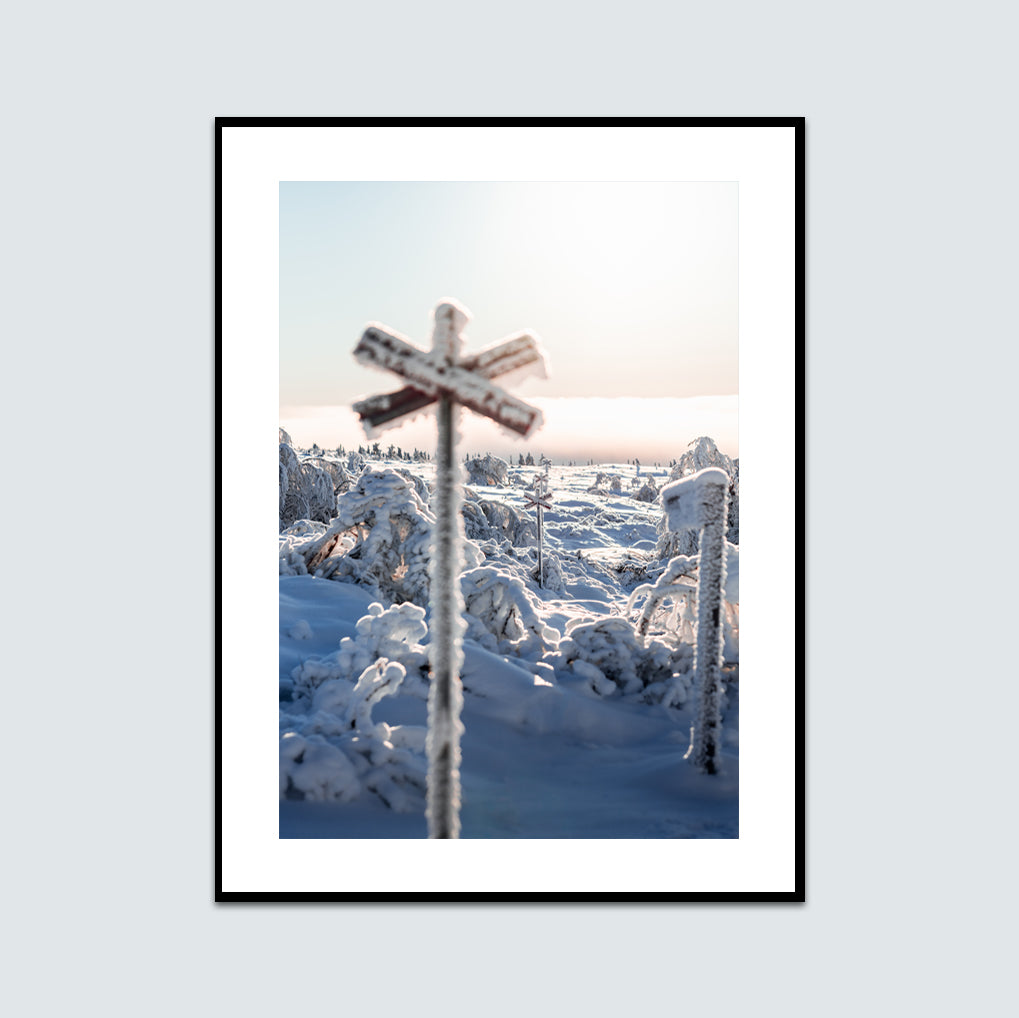 Postern kan väljas att köpas färdigmonterad i ram. Välj mellan svart-, vit- och ekfärgad ram. Levereras med akrylglas och anordning för upphängning bak.